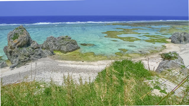 ・しかし、海はやはり”沖縄”の海。外周を珊瑚礁に囲まれ、砂浜はサンゴの白破片と波が砕き磨いた貝殻の色彩片が溶けあわずぎっしりと混成。その上を海水が青に緑に色を変えながら、遠浅の沖まで続きます。それらのビーチの多くは島中央部・フェリー港付近の民家・宿泊エリアから遠く、せっかくの美しい景色なのに人がほとんど訪れずもったいないほど(2か所の遊泳ビーチもフェリー港から遠く離れた島の南端・北端)。