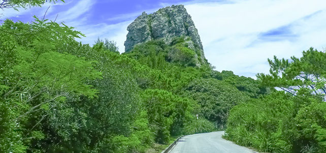 ・自然の造形では、島南端海岸崖部の特異な形の山体・岩体がつくりだす景色が妖しくもスペクタクル。陸には三角定規を置いたような山稜や四角い岩柱が並び競い、それに連なるように岩群が直下の海原に散る。付近には展望エリアや一部海岸に下りる道が整備され、様々なアングルでその景観を楽しめます。