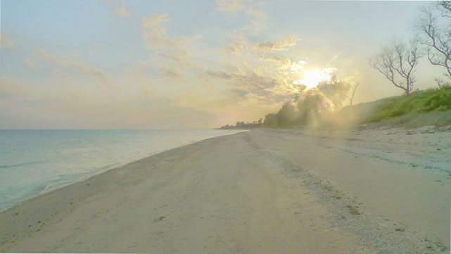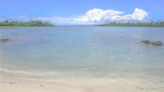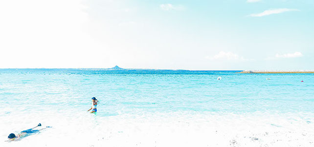 「水納島(みんなじま)」:有人離島としては沖縄でも特に小さな島の一つで、周辺地元では海水浴の島として知られる島。一面の白砂ビーチの美しさに加え、島内各スポットにつながる野道草道の散策も楽しめます。島の中央部に深く入り込む小さな島には不つり合いに大きな入江も、この島だけの風景。