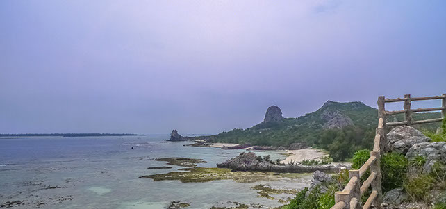 「伊江島(いえじま)」:この島は、何よりも島中央にそそりたち魔界の山のごとく周囲を威圧する「城山」の姿が印象的(山頂への登山も可能)。島の北部海岸には連なる断崖、南部海岸にはなだらかな農牧地を海原へゆるりと抜ける道風景。険しさと穏やかさをあわせ持ち、広さと高さを楽しめる島です。