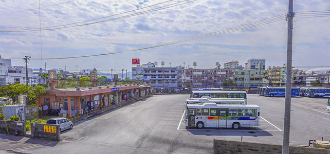 ・「ターミナル」といっても大規模ではなく、市街地の外れにある「ローカル」な雰囲気の施設。入口付近に平屋のターミナル建物があり、運行会社事務所(琉球バス・沖縄バス)・降車ホーム・食堂や購買店などが入っています。