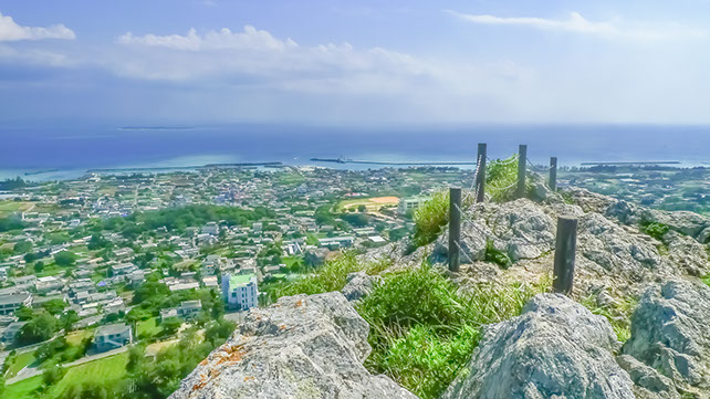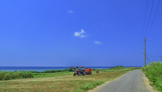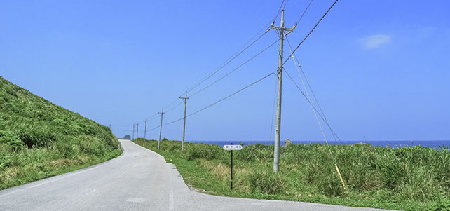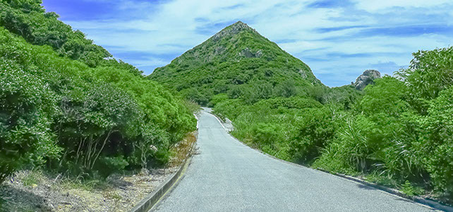 「伊江島(いえじま)」:この島は、何よりも島中央にそそりたち魔界の山のごとく周囲を威圧する「城山」の姿が印象的(山頂への登山も可能)。島の北部海岸には連なる断崖、南部海岸にはなだらかな農牧地を海原へゆるりと抜ける道風景。険しさと穏やかさをあわせ持ち、広さと高さを楽しめる島です。