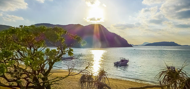 ・島中部の西海岸部には、海水の透明度が高く沖の島々の眺めも美しい海水浴ビーチが2つあり夏はマリンレジャーで大いににぎわいます。冬期(1月~3月頃)には、島は”ホエールウォッチング”のツアーボートの拠点にもなり、それ以外の時期にもダイビングなど全国から訪れる客が絶えません。