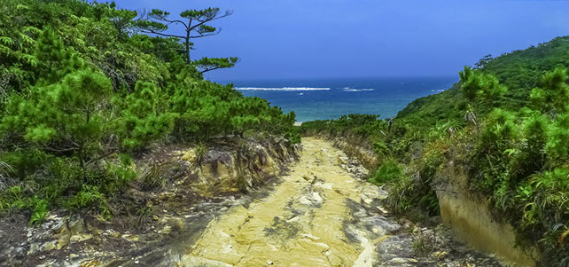 「トンネル岩」付近からは クバ林の繁る岩の丘へ「長い階段」がのび